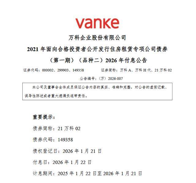 1月21日早间,万科A发布公告,万科企业股份有限公司2021年面向合格投资者公开发行住房租赁专项公司债券(第一期)(品种二)(债券简称“21万科02”)将于2026年1月22日支付自2025年1月22日至2026年1月21日期间的利息。