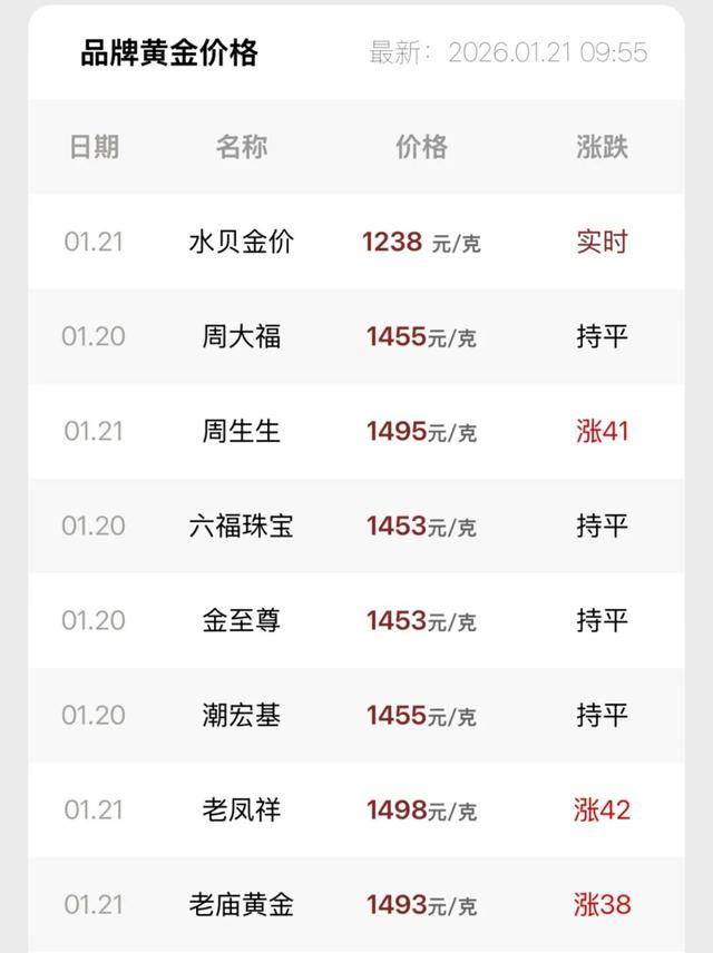 今日,周生生金饰报价1495元/克,单日上涨41元;老凤祥报价1498元/克,单日上涨42元/克;老庙黄金报价1493元/克,单日上涨38元/克。