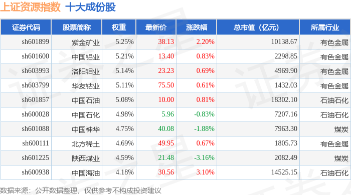 上证资源(000068)指数十大成份股详情如下: