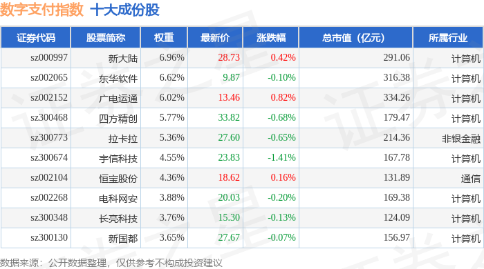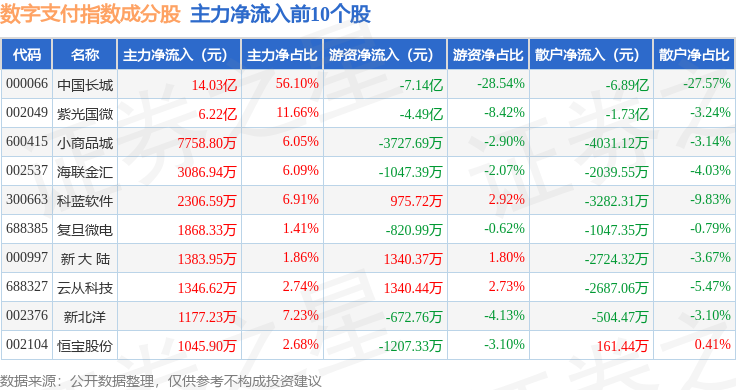 资金流向方面,数字支付(980113)指数成份股当日主力资金净流入合计10.6亿元,游资资金净流出合计6.56亿元,散户资金净流出合计4.05亿元。成份股资金流向详情见下表: