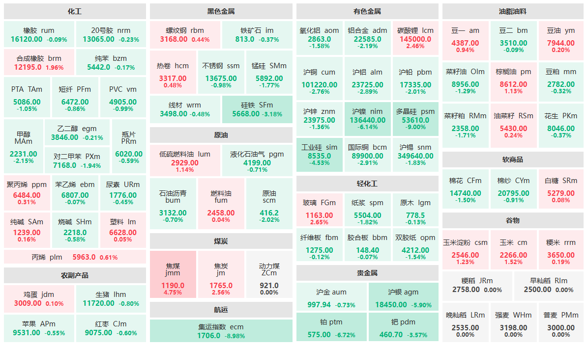 黑色系方面,焦煤涨超4%,焦炭涨超2%,硅铁跌超4%。