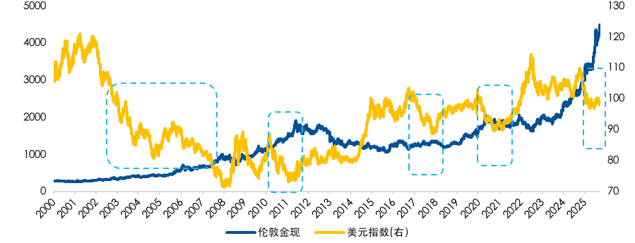 与此同时,政府对美联储政策的干预力度加大,加上美联储主席换届临近,市场普遍担忧其政策独立性下降。财政失衡与货币层面的不确定性相互叠加,导致投资者对美元体系及美元资产的信心下滑,推动美元进入贬值通道。作为美元体系的重要替代选项,黄金的货币属性价值充分释放,吸引全球资金增配。历史上每一轮弱美元时期,黄金均迎来了不错涨幅。