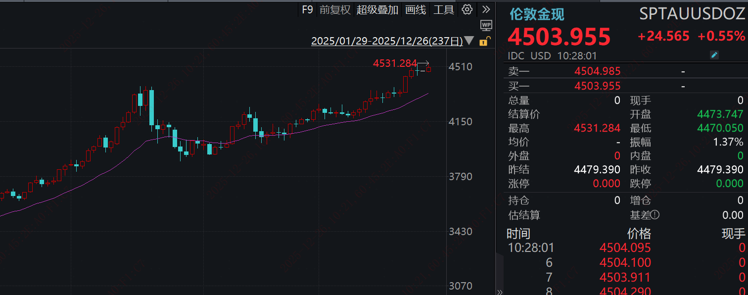 上周伦敦金现货盘中再度刷新历史高点,最高价突破4500美元/盎司,成功突破前期阶段性高点。宏观数据层面,美国通胀延续回落态势,11月CPI同比降至约2.7%,通胀中枢呈现下移趋势;就业端来看,近月美国失业率运行于相对偏高区间,劳动力市场由紧转松的边际变化持续延续。从利率预期与美元近期走势来看,市场对2026年美联储进一步降息的预期有所抬升,美元指数维持偏弱运行格局。