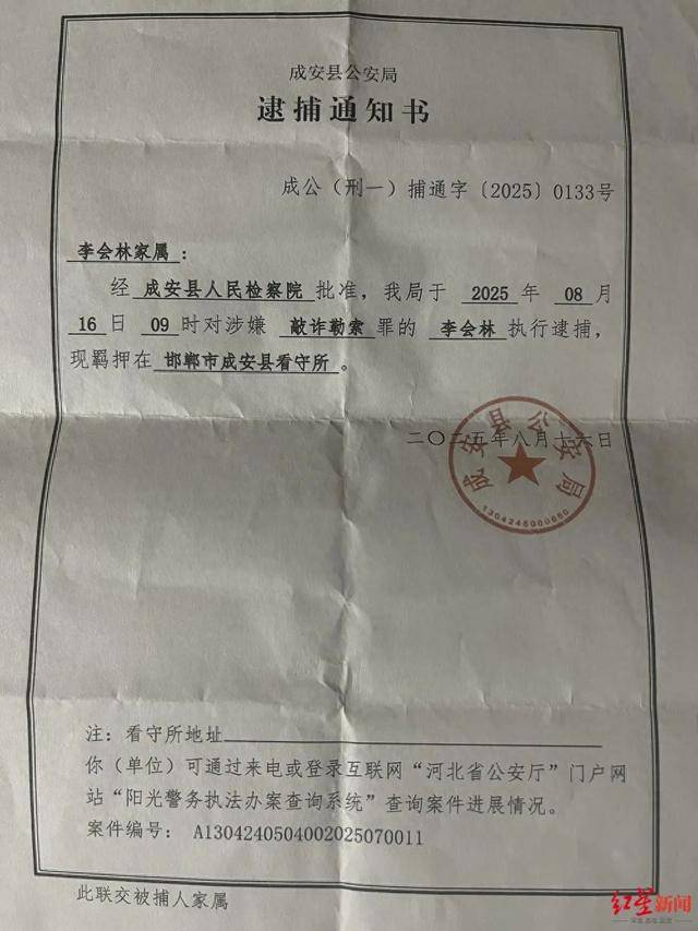 相关通知书显示,李会林2025年8月1日因涉嫌敲诈勒索罪被成安县公安局刑事拘留,李春梅和李小月8月2日因涉嫌敲诈勒索罪被成安县公安局刑事拘留。8月15日,因成安县人民检察院不批准逮捕,李春梅和李小月被取保候审并释放。8月16日,李会林被执行逮捕。