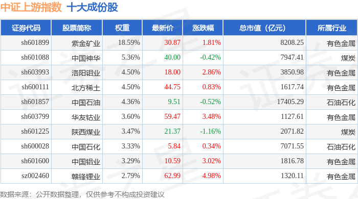 证券之星消息,12月17日,中证上游(000961)指数报收于4703.93点,涨2.34%,成交737.26亿元,换手率0.63%。当日该指数成份股中,上涨的有44家,中钨高新以9.44%的涨幅领涨,下跌的有5家,陕西煤业以1.16%的跌幅领跌。