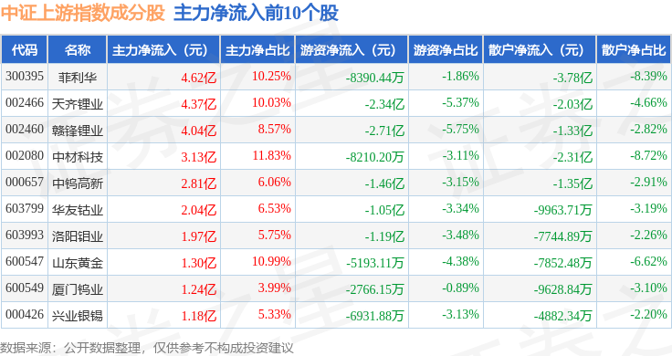 资金流向方面,中证上游(000961)指数成份股当日主力资金净流入合计24.47亿元,游资资金净流出合计18.29亿元,散户资金净流出合计6.18亿元。成份股资金流向详情见下表: