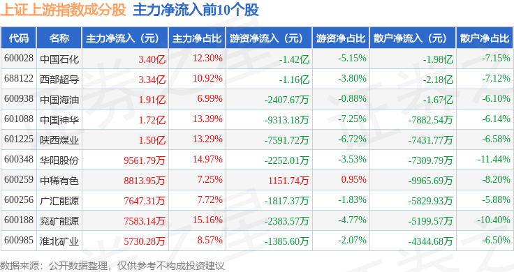 资金流向方面,上证上游(000094)指数成份股当日主力资金净流出合计14.94亿元,游资资金净流出合计1.52亿元,散户资金净流入合计16.46亿元。成份股资金流向详情见下表: