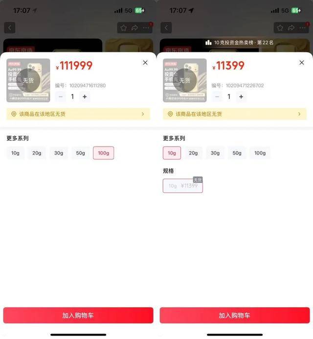 记者在平台上看到,截至1月22日17时,平台上深圳地区除30g的黄金手机壳外,其余均已显示无货。