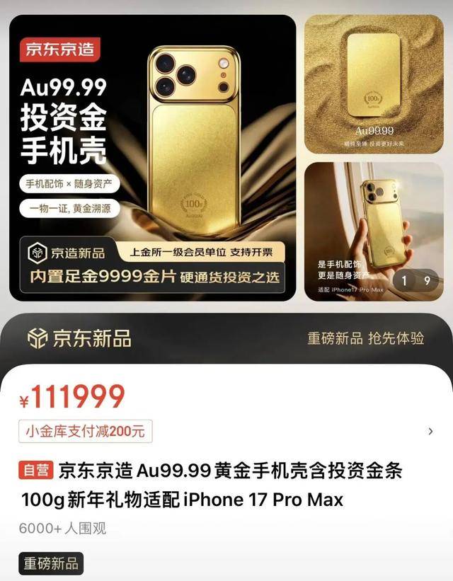 记者在京东平台看到,京东京造旗舰店已上架一款Au99.99黄金手机壳,按黄金重量价格分5个档位,10g的标价11299元、20g的标价22499元、30g的标价33699元、50g的标价56199元、100g的标价112299元。平台页面显示,这款黄金手机壳已吸引上万人围观。
