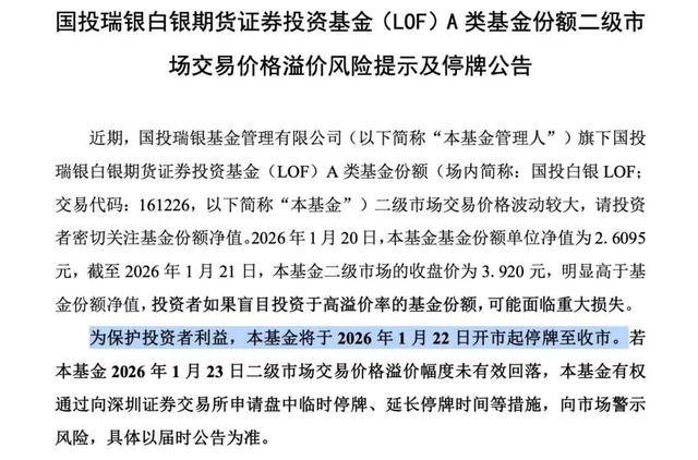 1月21日晚间,国投白银LOF基金(以下简称"本基金")发布公告称,为保护投资者利益,本基金将于1月22日开市起停牌至收市。若本基金1月23日二级市场交易价格溢价幅度未有效回落,本基金有权通过向深交所申请盘中临时停牌、延长停牌时间等措施,向市场警示风险。