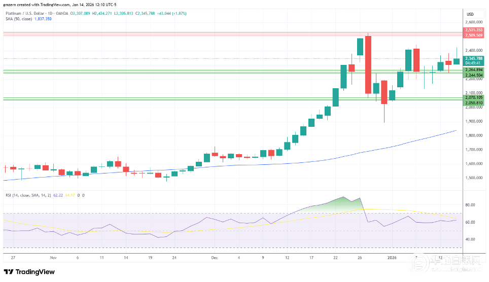 倘若铂金价格涨至2450美元以上,它将会向2510美元至2530美元的阻力位移动。