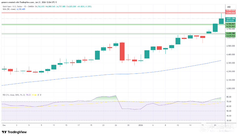 如果黄金能够突破4890至4900美元阻力位,则将朝着重要心理水平5000美元价位迈进。
