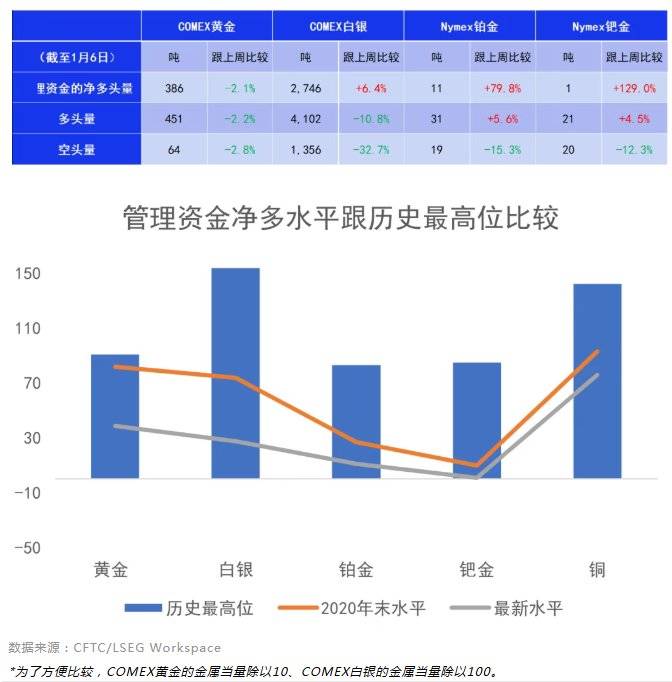 智通财经APP获悉,欧洲天然资源基金特约分析师李冈峰称,至1月6号为止,除了黄金和铜外其他各金属的基金净多均出现环比增长,当中钯金合约经历了2周基金净空后,再次升回净多头。美期黄金基金净多环比跌2%至386吨,为过去5周最低水平。美铜基金空头已经跌至自2007年有记录以来最低水平,代表市场对铜的情绪明显过分乐观。基金空头已从3周前最低水平反弹7.3%,多头亦从同一时段跌10.4%。