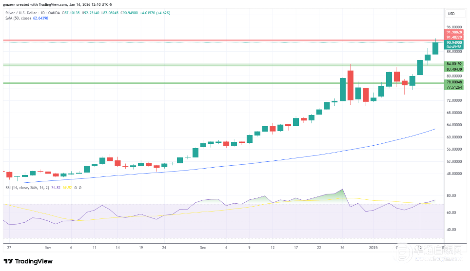 若能银价突破91.50美元至92.00美元阻力位,则将有望涨至95.00美元水平。