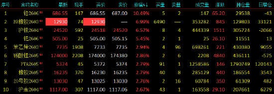 2026年1月23日,早盘开盘,国内期货主力合约涨多跌少。铂涨超10%,合成橡胶封涨停,涨幅6.99%,沪银涨超6%,钯涨超5%,20号胶、苯乙烯(EB)、PTA、橡胶涨近3%,碳酸锂、瓶片、纯苯、短纤、乙二醇(EG)涨超2%;跌幅方面,SC原油跌超2%,低硫燃料油(LU)跌近1%。