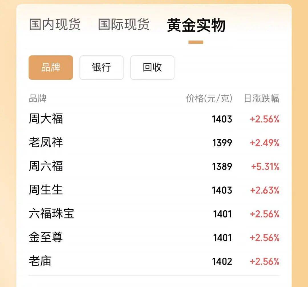 受近期国际金价影响,以人民币计价的黄金价格再创新高。12月23日,多个品牌足金饰品报价首次冲上每克1400元。周生生足金饰品标价1403元/克,较前一日1367元/克的价格上涨36元/克;周大福、周大生足金饰品标价1403元/克,较前一日1368元/克的价格上涨35元/克;老凤祥足金饰品标价1399元/克,较前一日1365元/克的价格上涨34元/克;老庙黄金足金饰品标价1402元/克,较前一日1367元/克的价格上涨35元/克。