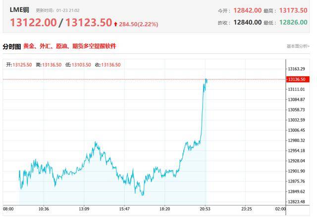 1月23日,LME伦铜涨幅扩大,日内一度上涨3%。国内商品期货夜盘开盘也多数上涨,其中沪铜涨超2%。