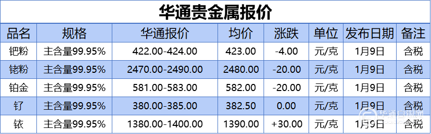 华通白银网 1月9日讯:钯粉、铑粉、铂金、钌、铱报价