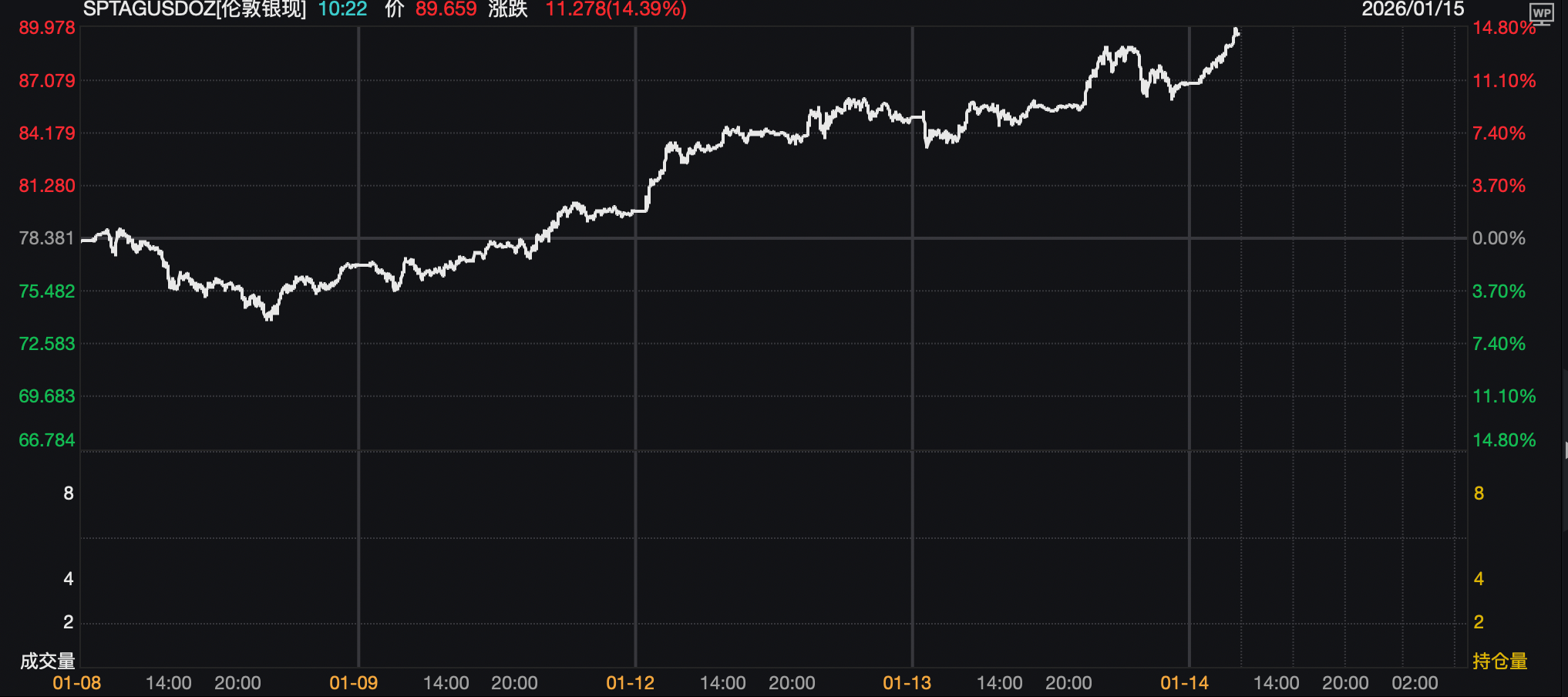 1月14日亚洲交易时间,现货白银(伦敦银现)首次突破90美元/盎司,截至发稿时涨3.25%,报89.745美元/盎司。COMEX白银期货报89.535美元/盎司,涨3.7%。