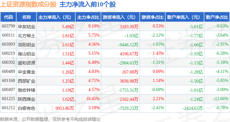 资金流向方面,上证资源(000068)指数成份股当日主力资金净流出合计10.44亿元,游资资金净流入合计7.18亿元,散户资金净流入合计3.26亿元。成份股资金流向详情见下表: