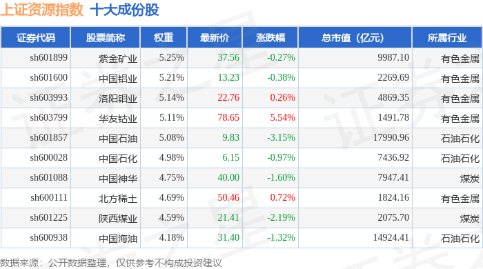 上证资源(000068)指数十大成份股详情如下: