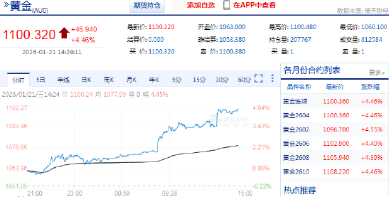 2026年1月21日,沪金主力合约强势突破1100元整数关口,日内涨超4%,续创历史新高,本月累涨超10%。