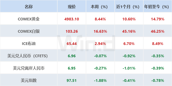 外汇市场方面,美元指数下跌1.88%;人民币对美元汇率小幅波动,美元兑在岸人民币(CFETS)下跌0.07%,美元兑离岸人民币下跌0.27%。