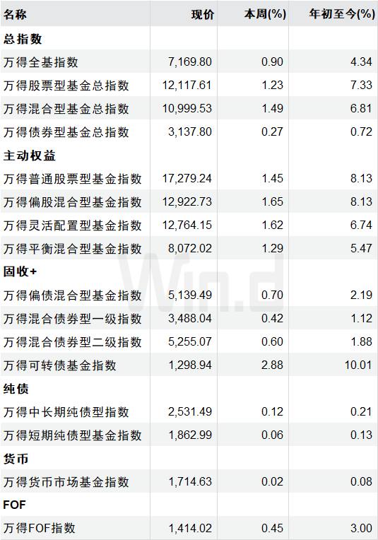 最近一周,万得基金指数整体表现较好。具体来看:万得全基指数上涨0.90%;万得股票型基金总指数上涨1.23%;万得混合型基金总指数上涨1.49%;万得普通股票型基金指数上涨1.45%;万得偏股混合型基金指数上涨1.65%;万得灵活配置型基金指数上涨1.62%。