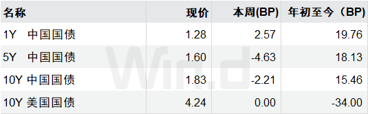 最近一周,国债收益率表现分化。1年期中国国债收益率上行2.57个基点至1.28%,5年期下行4.63个基点至1.60%,10年期下行2.21个基点至1.83%。10年期美国国债收益率持平为4.24%。