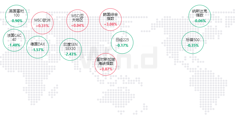 亚洲市场方面: 日经225指数小幅下跌0.17%;韩国综合指数大涨3.08%,富时新加坡海峡指数上涨0.87%,印度SENSEX30指数下跌2.43%。