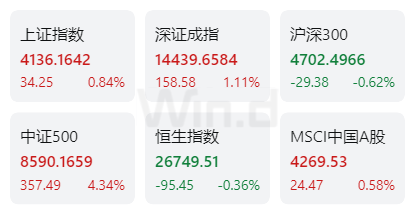 中国市场方面: 上证指数上涨0.83%,深证成指上涨1.11%,沪深300指数下跌0.62%,中证500指数上涨4.34;恒生指数下跌0.36%。