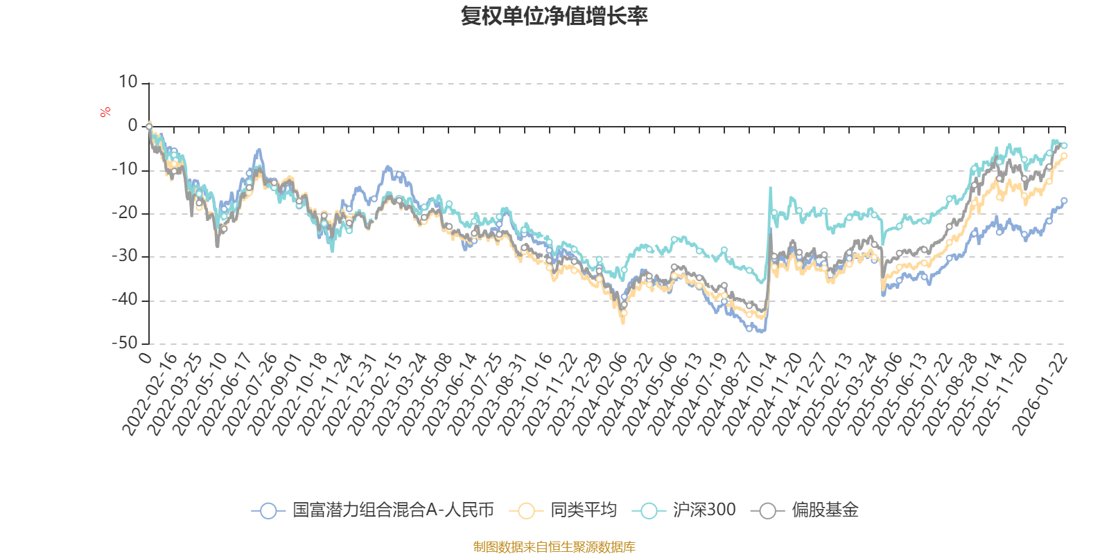 截至1月22日,国富潜力组合混合A-人民币近三个月复权单位净值增长率为8.62%,位于同类可比基金93/185;近半年复权单位净值增长率为18.99%,位于同类可比基金118/185;近一年复权单位净值增长率为23.53%,位于同类可比基金151/183;近三年复权单位净值增长率为-8.49%,位于同类可比基金158/176。
