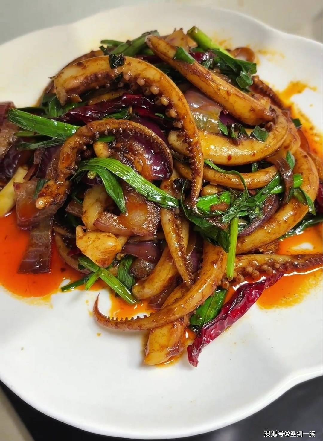 鲜鱿鱼、洋葱、青红椒、蒜苗、豆瓣酱、生抽、蚝油