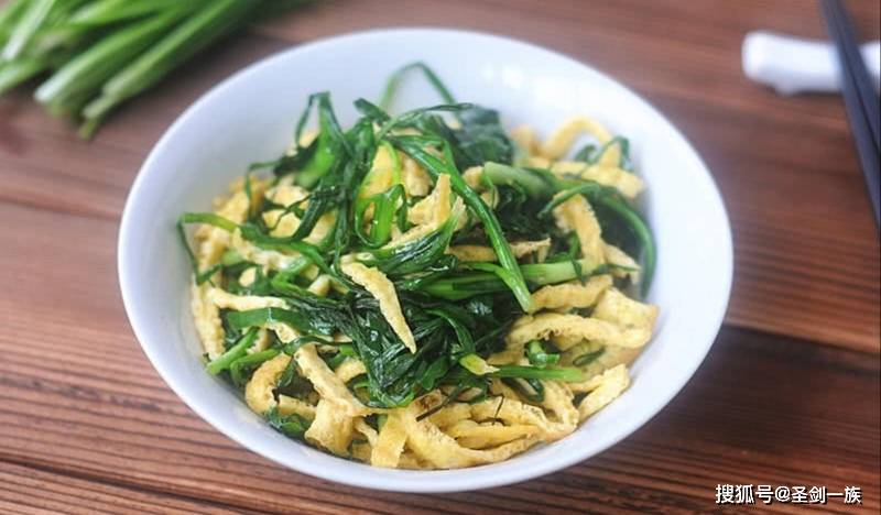4. 待韭菜变软,加入蛋皮丝快速翻炒。