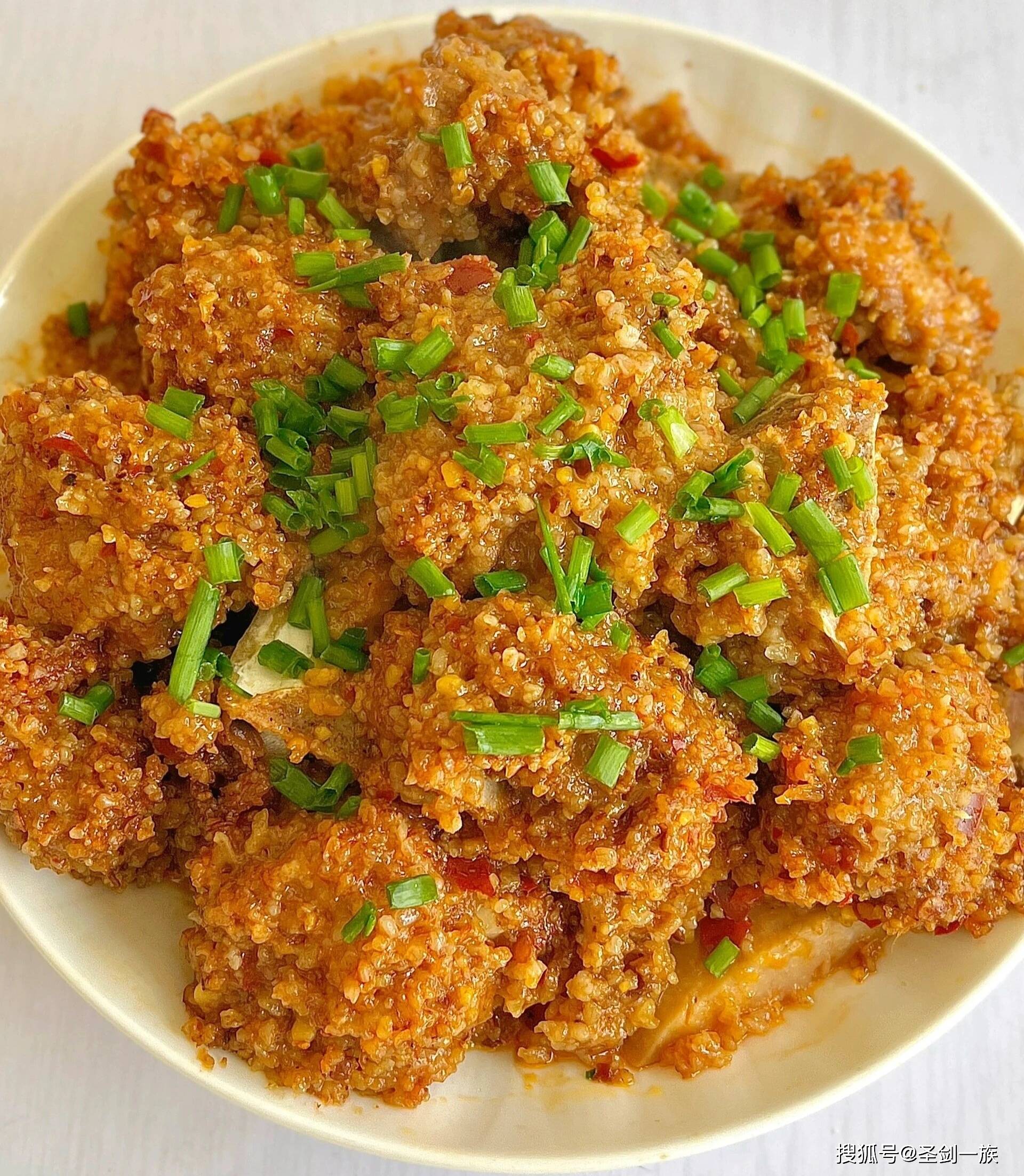 3、盘子里铺一层土豆块或红薯块,摆上腌制好的排骨,水开上锅蒸1小时左右,出锅后撒葱花点缀即可。
