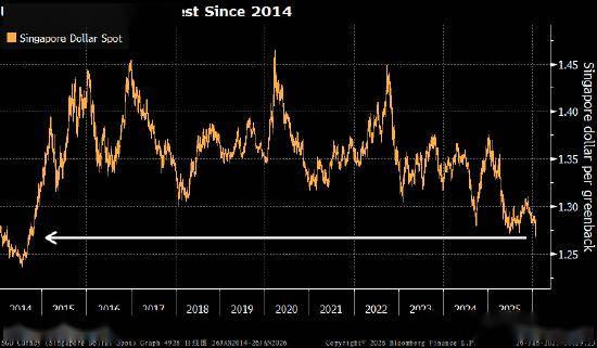 新加坡元兑美元汇率攀升至2014年10月以来的最高水平,受到避险资金所推动,而该国央行预计将于本周维持政策不变。