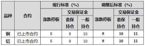 铜期货已上市合约的涨跌停板幅度调整为9%,套保持仓交易保证金比例调整为10%,一般持仓交易保证金比例调整为11%;