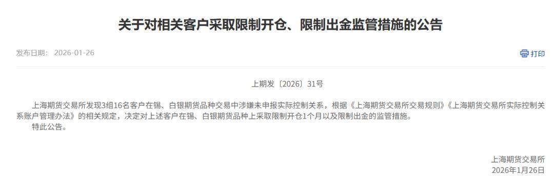 一是发现3组16名客户在锡、白银期货品种交易中涉嫌未申报实际控制关系,根据相关规定,决定对上述客户在锡、白银期货品种上采取限制开仓1个月以及限制出金的监管措施。