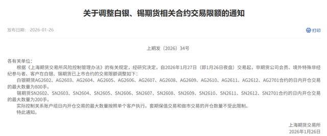 1月26日,上海期货交易所发布通知,调整白银、锡期货相关合约交易限额。