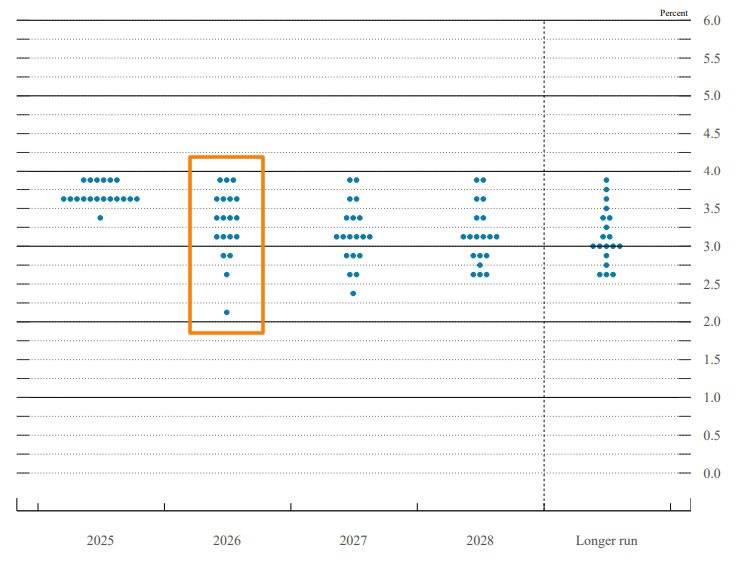 12月点阵图显示,各政策制定者对2026年底利率的看法分歧较大。来源:Federal Reserve 编辑