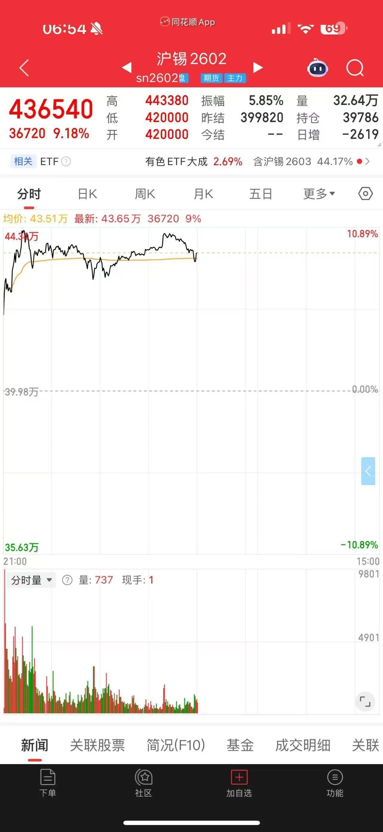 昨日夜盘时段,沪锡期货主力合约再度大涨,盘中一度突破44万元/吨大关,截至收盘上涨逾9%。