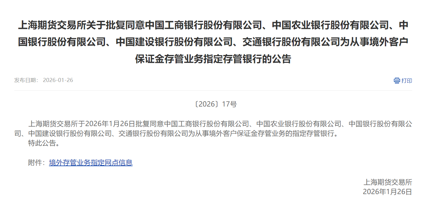 【大河财立方消息】1月26日,上海期货交易所批复,同意中国工商银行、中国农业银行、中国银行、中国建设银行、交通银行为从事境外客户保证金存管业务的指定存管银行。