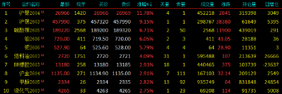 2026年1月26日,早盘开盘,国内期货主力合约涨多跌少,沪银涨超11%,沪锡涨超9%,碳酸锂、铂涨超6%,钯涨超5%,燃油涨超4%,合成橡胶、液化石油气(LPG)、SC原油、沪铜涨超2%。跌幅方面,纸浆跌超1%,棉花、烧碱跌近1%。