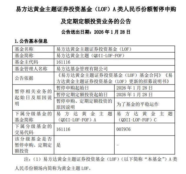 1月27日晚间,易方达黄金主题LOF发布公告称,易方达基金决定自1月28日起暂停本基金A类份额的申购及定期定额投资业务,赎回业务照常办理。本基金A类份额恢复办理申购、定期定额投资业务的时间将另行公告。