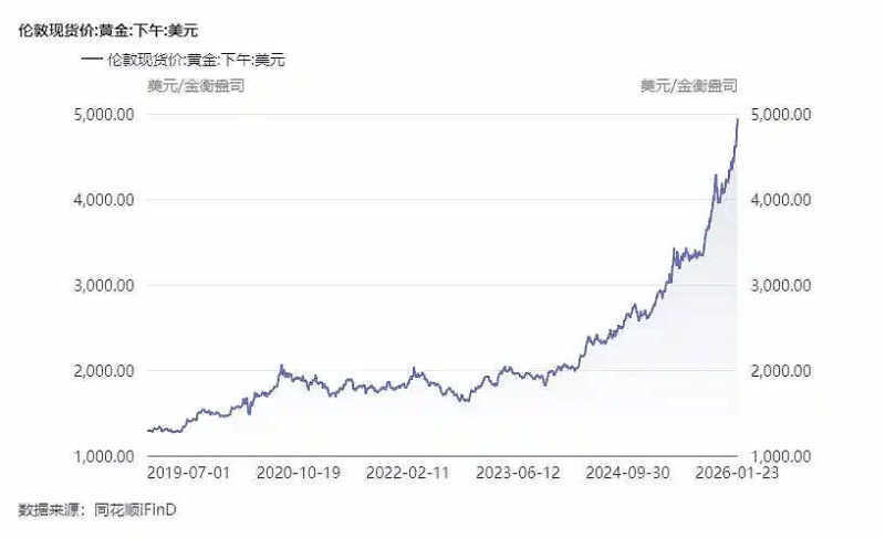 1月26日,纽约COMEX黄金期货价格盘中一度突破5107美元,但随后金价高位回落,COMEX黄金期货收报5004.8美元/盎司,盘中震荡超一百美元。至此,本月金价涨幅已累计达到约18%,有望创下40多年来的最大单月涨幅。