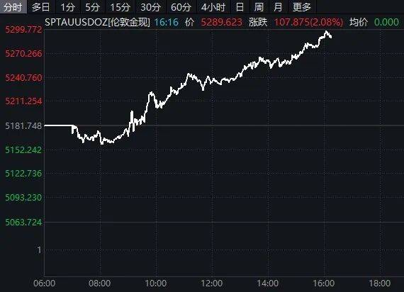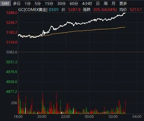 国际金价持续冲高,纽约期金逼近5300美元/盎司,涨逾4%;现货黄金向上突破5280美元/盎司,涨超2%。