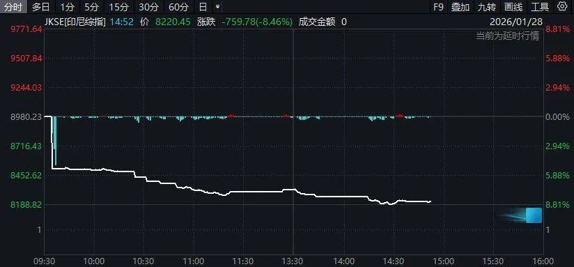 稍早时候,印度尼西亚股票基准指数下跌8%至8261.79点,触发市场停盘,交易暂停30分钟后恢复。此前MSCI表示,在监管机构解决上市公司股权过于集中的问题之前,将暂停某些指数调整,此举令这个东南亚最大市场遭遇最新挫折。该指数编制机构在声明中表示,将立即停止新增指数成份股,并冻结增加可供投资者购买的股票数量,理由是持续存在“基本投资可行性问题”,以及投资者对潜在蓄意操纵价格感到担忧。