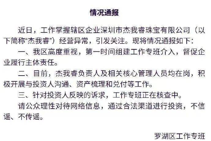 近日,工作掌握辖区企业深圳市杰我睿珠宝有限公司(以下简称"杰我睿")经营异常,引发关注。现将情况通报如下:
