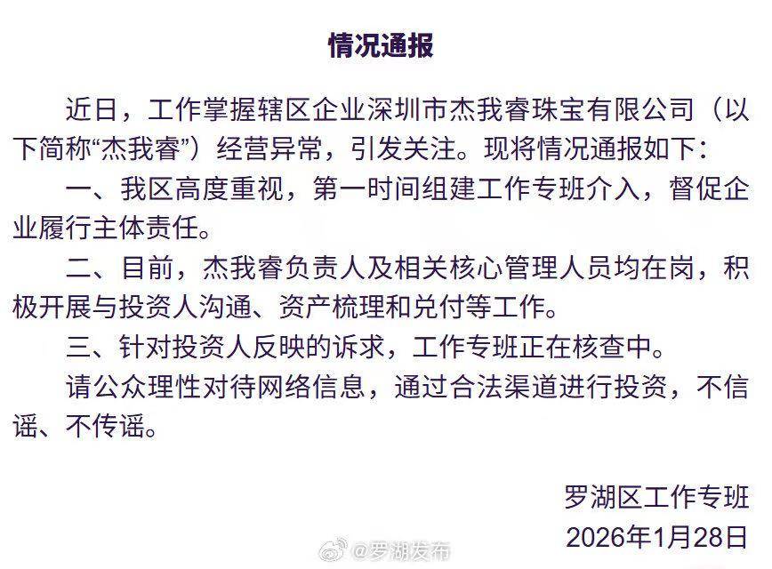 上证报中国证券网讯(记者 徐潇潇 杨子晏)1月28日,针对水贝一黄金预定价平台兑付困难一事,深圳市罗湖区工作专班发布公告称,近日,工作掌握辖区企业杰我睿经营异常,引发关注。罗湖区第一时间组建工作专班介入,督促企业履行主体责任。目前,杰我睿负责人及相关核心管理人员均在岗,积极开展与投资人沟通、资产梳理和兑付等工作。针对投资人反映的诉求,工作专班正在核查中。