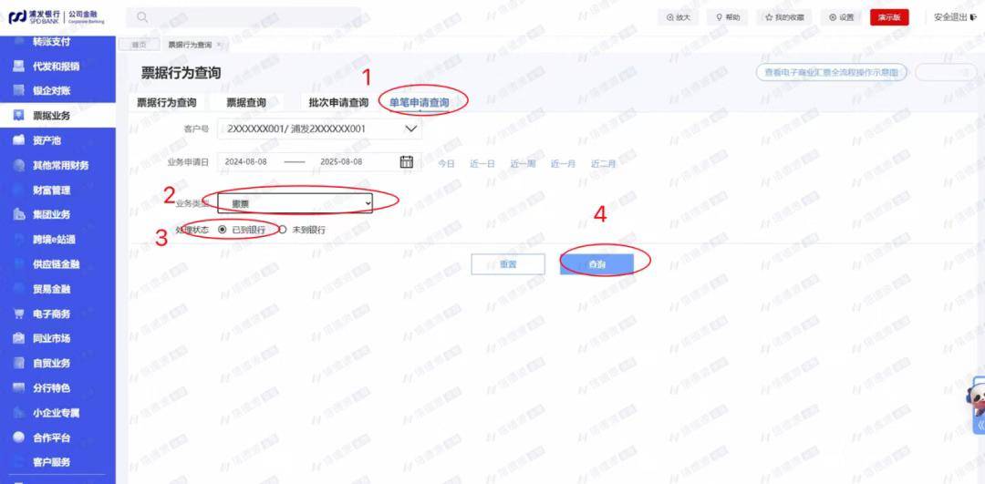 接下来点击 票据业务 - 新一代电子商业汇票 - 票据行为查询。